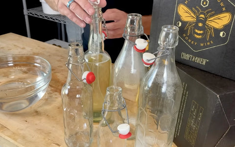 You’ll need roughly ten 12oz bottles (or eight 16oz bottles). We recommend using swing-top bottles, like Grolsch beer bottles. You can always buy a couple of 6 packs and use the empties. OR you can use our Mead Bottling Kit. Swing tops bottles are also available at craft stores or your local homebrew shop.